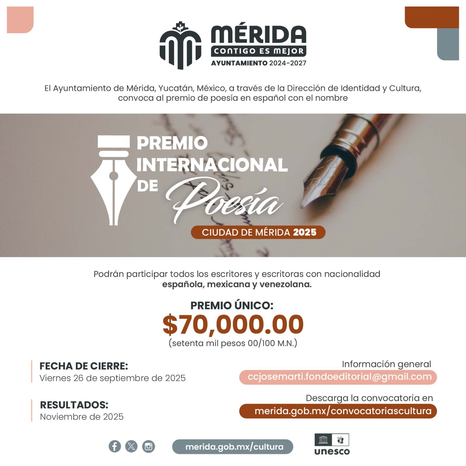 Al hablar del Premio Internacional de Poesía Ciudad de Mérida, Josué Morelos Echeverría, subdirector de Conservación y Difusión Patrimonial, destacó que esta edición de la convocatoria estará abierta a personas con nacionalidad española, mexicana o venezolana, independientemente del lugar donde resida, y contando con el documento que lo avale a la hora de enviar su registro.