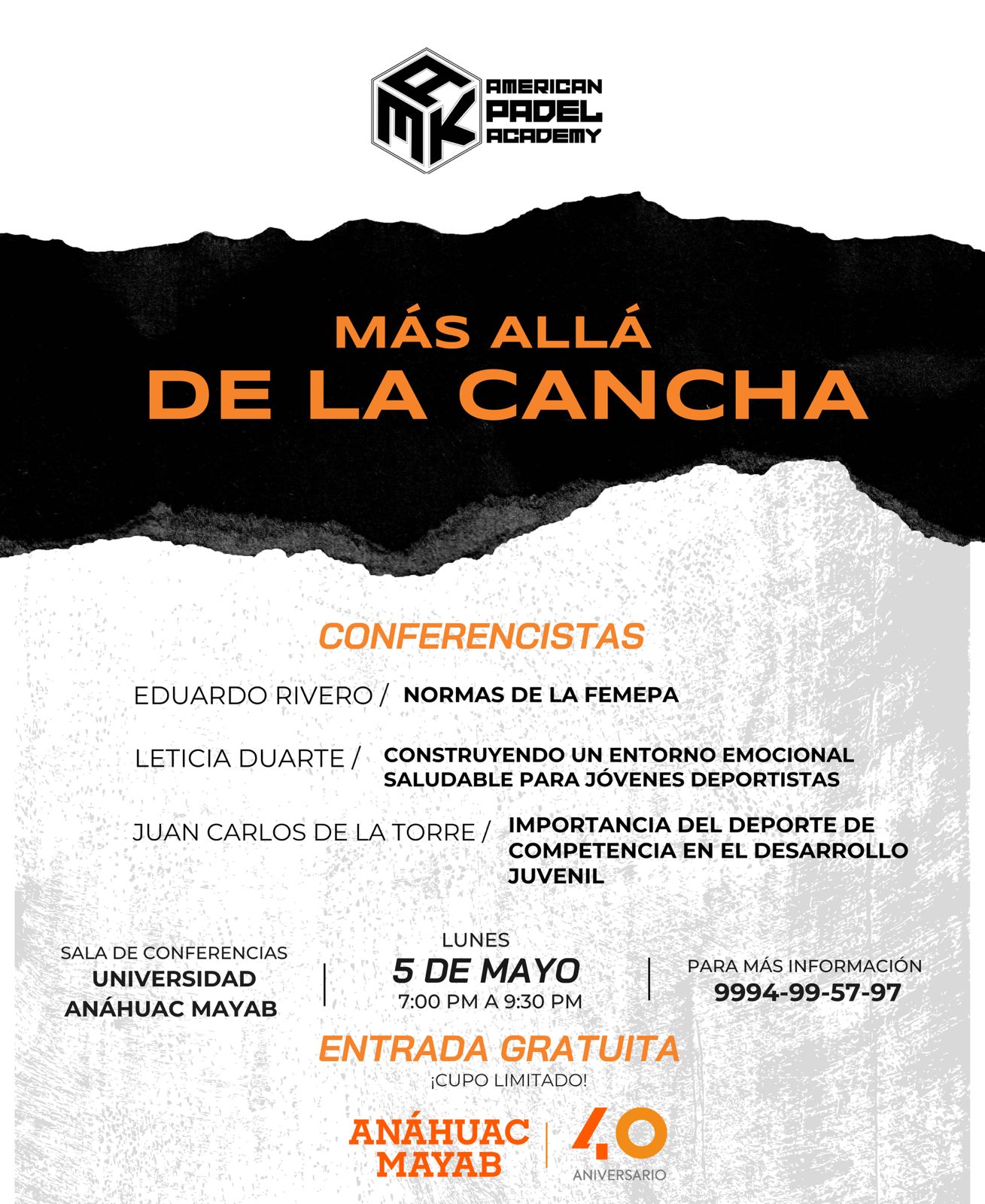 Para propiciar un desarrollo deportivo optimo a sus jugadores, la American Padel Academy en coordinación con la Anáhuac Mayab realizará el foro “Más allá de la Cancha”, y con ello fomentar la comunicación efectiva entre padres e hijos, como factor importante en el desempeño de los deportistas.