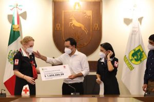 Junto con la delegada estatal de la Cruz Roja Mexicana, Michelle Byrne John de Rodríguez, Vila Dosal realizó su donativo personal y entregó la aportación de 1.6 millones de pesos por parte del Gobierno del Estado a la colecta de esta benemérita institución, que este año tiene como lema “Ayúdanos a tener una batalla justa” y una meta de recaudación de 4 millones de pesos.