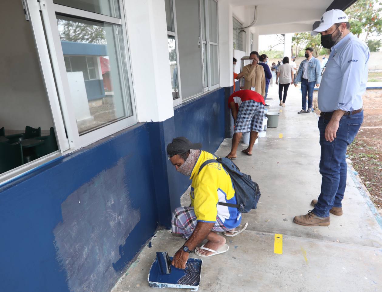 En dicha localidad, desde temprana hora, 7 equipos comenzaron a trabajar en el Colegio de Bachilleres del Estado (Cobay), Plantel Hunucmá; otros 6, en la Escuela Secundaria Estatal número 17 “Emiliano Zapata”, y 12 más se desplegaron en diferentes zonas del puerto de Sisal, donde realizaron labores de limpieza, desyerbe y pintura, dentro y fuera de aulas.