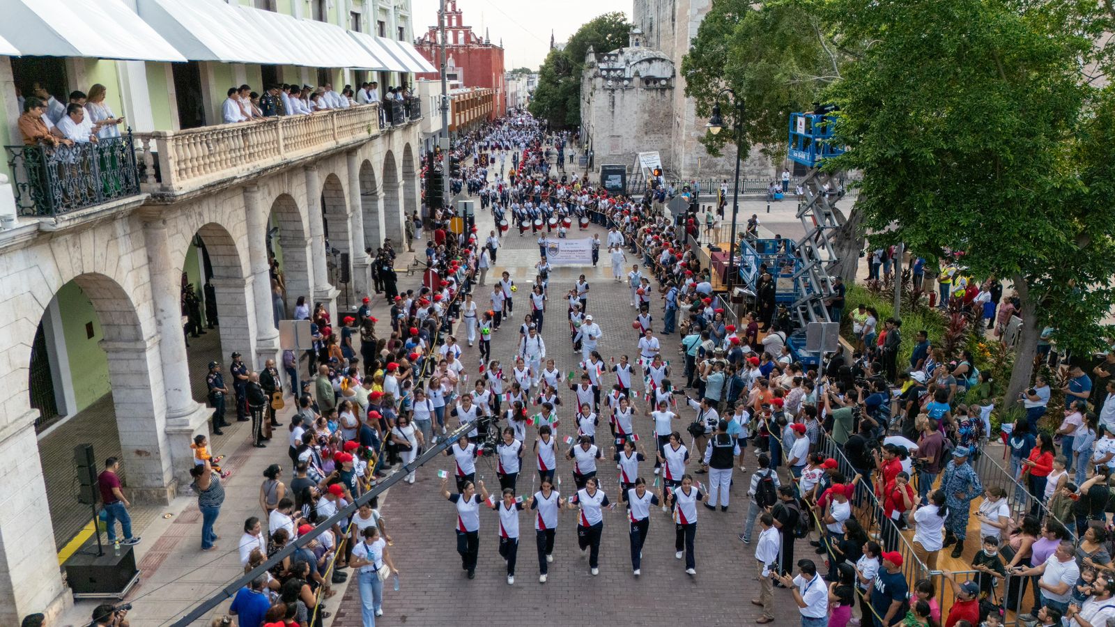 Junto con la presidenta del Sistema para el Desarrollo Integral de la Familia (Yucatán), la maestra Wendy Méndez Naal, y sus hijos Julián y Joaquín, el Gobernador presenció la participación de un total de 4,652 elementos divididos en 64 contingentes, que a su paso dieron muestra de marcialidad en el recorrido, que partió de Paseo de Montejo y culminó en el barrio de San Juan, pasando por las principales calles del Centro Histórico de la ciudad de Mérida.