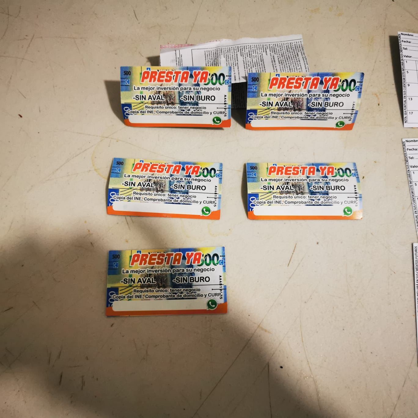 Elementos de la corporación identifican esta unidad que circulaba sobre la carretera Mérida-Cancún, por lo que se procede a su detención y al realizarles una revisión preventiva se les encuentran tarjetas donde promocionaban sus préstamos, así como cuadernillos donde anotaban los pagos que realizaban distintos deudores.