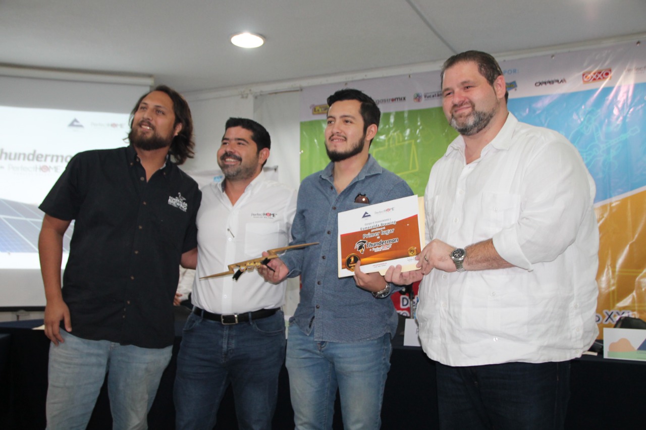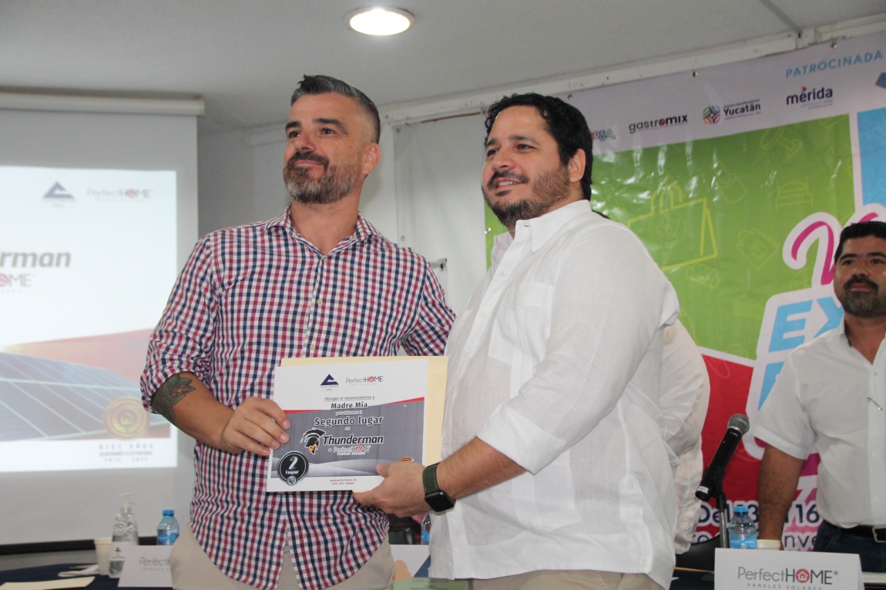 El presidente de la Canaco Mérida y el director general de Perfect Home, Alfonso González, entregaron los premios a los tres primeros lugares del primer certamen Thunderman convocado para emprendedores por la empresa líder de la región en venta, diseño e instalación de paneles solares certificados para hogares, industrias, negocios y granjas solares.