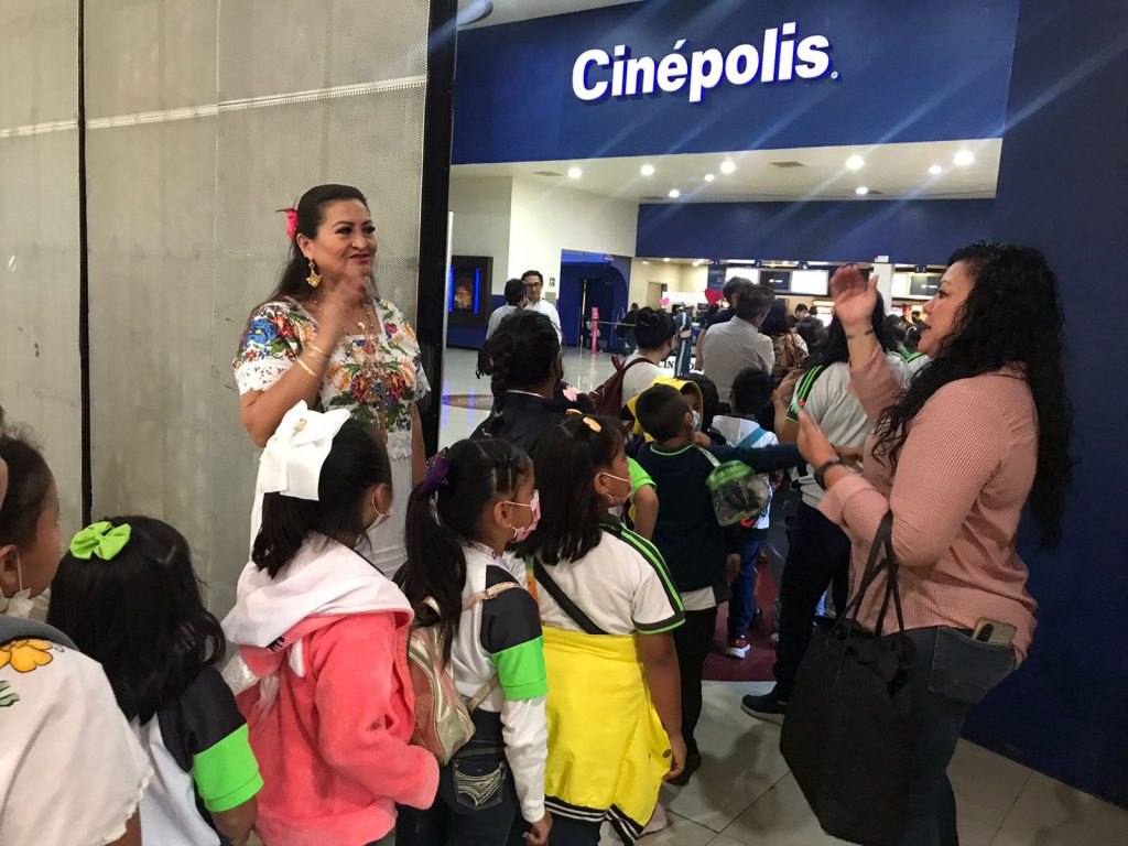 La Legisladora, Carmen Navarrete acompañó a los asistentes hasta la entrada de las salas 1 y 8, y supervisó que se les entregara el combo de palomitas y refrescos.