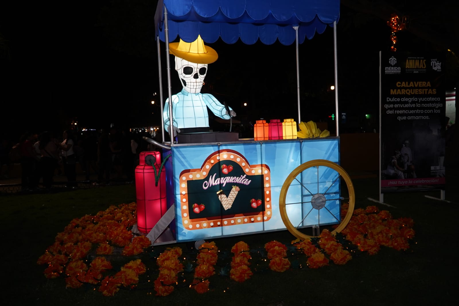 La Calavera Panadero con Triciclo (2.40 metros), con el pan recién horneado, el alma del pueblo recorre las calles al amanecer; la Calavera Panuchos (1.80 metros), es el sabor de la tierra y el maíz que acompaña la memoria de quienes siguen entre nosotros; la Calavera Marquesitas (2.50 metros), dulce alegría yucateca que envuelve la nostalgia del reencuentro con los que amamos.