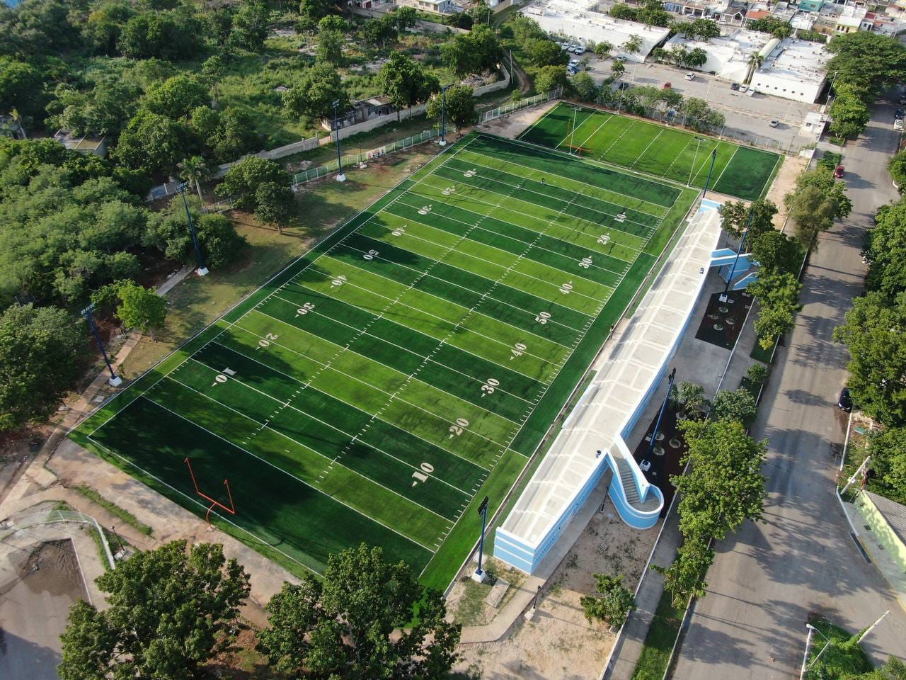 En lo que a los campos de fútbol americano, únicos en su tipo en el estado, y de tochito bandera respecta, se realizó la construcción de la base hidráulica y se suministró de luminarias para seguridad de los usuarios y de pasto sintético con un área de 6362.29 metros cuadrados. También, se colocaron y dio mantenimiento a las porterías de gol de campo y se rehabilitaron las zanjas colectoras, con el desazolve de pozos pluviales existentes.