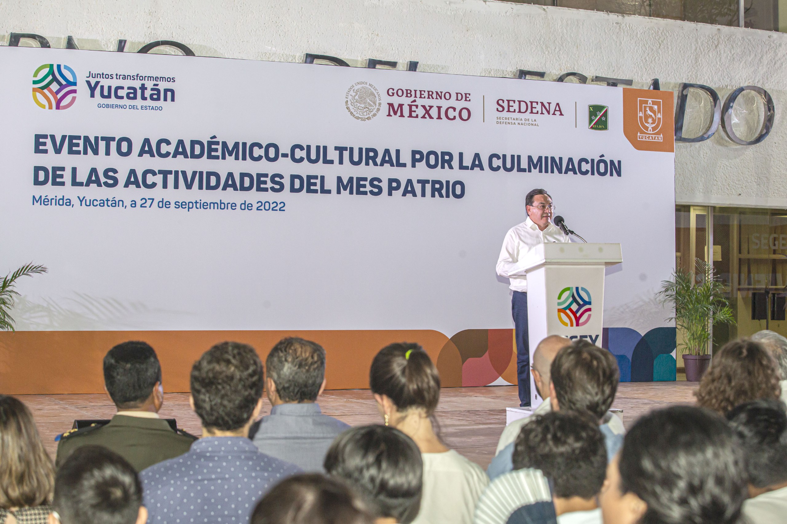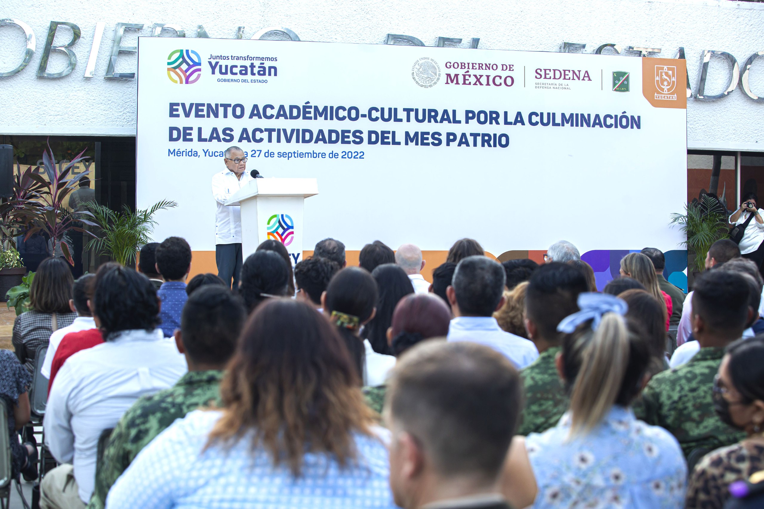 En el marco de la conmemoración de la Consumación de la Independencia de México, la Secretaría de Educación del Gobierno del Estado de Yucatán, realizó un evento académico- cultural que marcó la culminación de las actividades por las fiestas patrias.Para fortalecer los conocimientos sobre este proceso histórico se ofreció una conferencia magistral y un programa cultural que incluyó música, poesía y la tradicional jarana yucateca. La ocasión permite revalorar la participación de las mujeres y hombres que hicieron posible alcanzar la libertad de nuestro país.Encabezaron la actividad la secretaria general de gobierno, María Fritz Sierra en representación del gobernador Mauricio Vila Dosal; el titular de la Segey, Liborio Vidal Aguilar, el rector de la Universidad Autónoma de Yucatán, José de Jesús Williams y el general de división diplomado del Estado Mayor, Homero Mendoza Ruiz, comandante la X Región Militar, acompañados del General de brigada del Diplomado del Estado Mayor, Saúl Luna Jaimes, comandante de la 32/a Zona Militar y el Comisario Diplomado de Estado Mayor, Domingo Tito Bahena Salado, Coordinador Estatal de la Guardia Nacional.