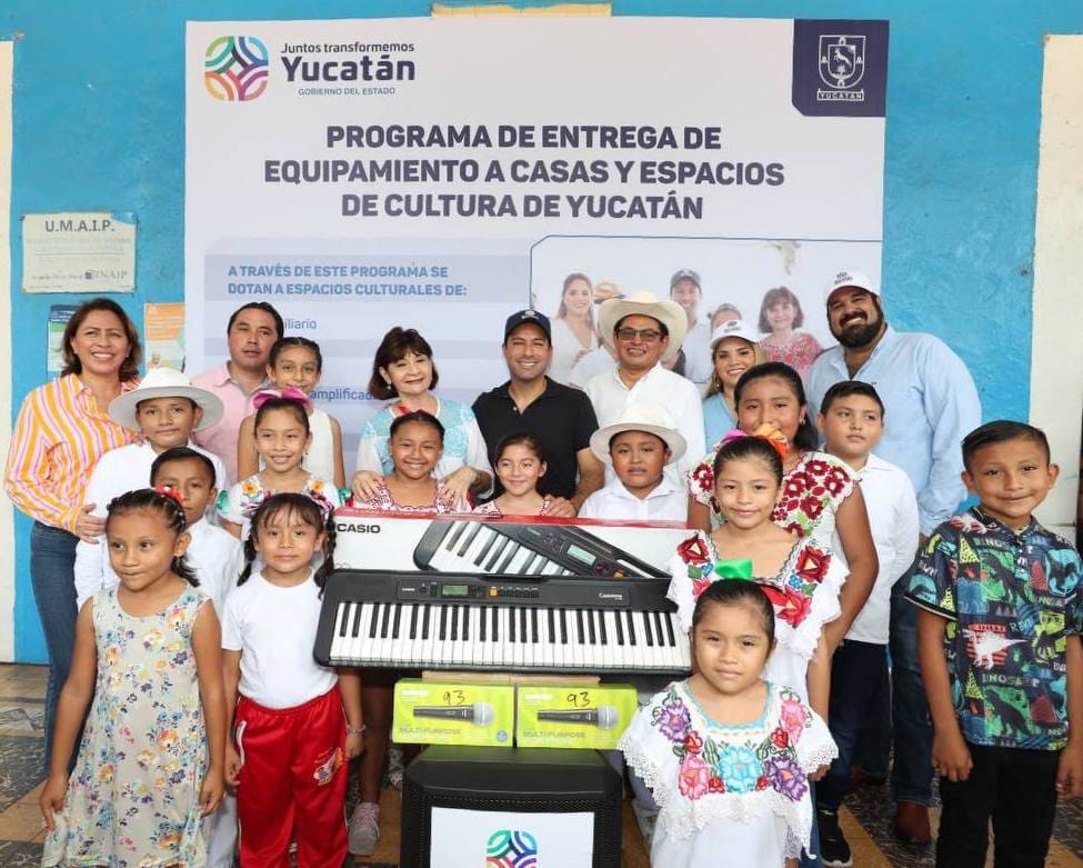 Para continuar con la formación artística de niñas, niños y jóvenes de este municipio, el Gobernador entregó equipos para los Espacios y Casas de la Cultural como mobiliario, pantallas, guitarras, bocinas amplificadas, teclados, micrófonos y talleristas por una inversión de 9.1 millones de pesos.