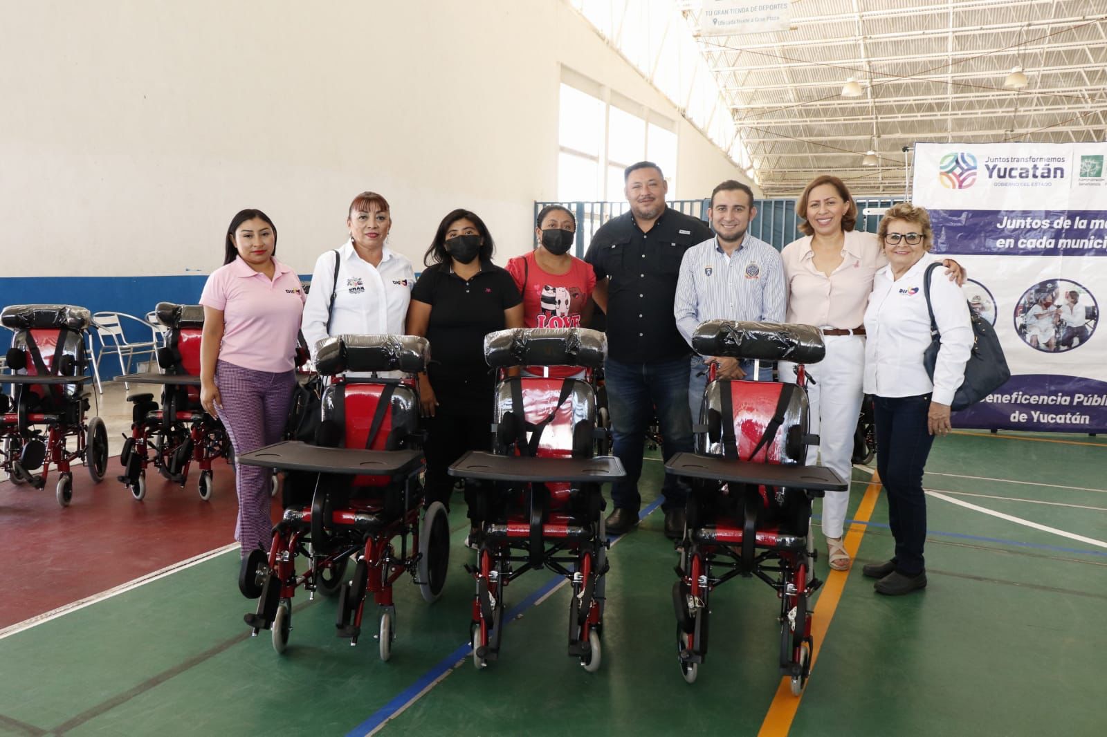 Trabajando por una vida digna para todos los umanenses el Sistema para el Desarrollo Integral de la Familia (DIF Umán) entregó tres sillas de ruedas para niños con parálisis cerebral.
