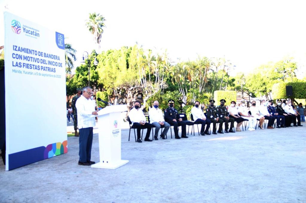 Autoridades civiles y militares encabezadas por la titular de la Secretaría General de Gobierno (SGG), María Fritz Sierra participaron esta mañana en la Ceremonia de Izamiento de la Bandera Nacional que marcó el arranque del programa de festejos “Yucatán celebra el Mes Patrio 2022 con motivo del 212 Aniversario de la Independencia de México.En representación del gobernador Mauricio Vila Dosal y con el apoyo de la escolta conformada por alumnas de la escuela primaria Manuel Sarrado de la Alianza de Camioneros, Fritz Sierra izó el Lábaro Patrio en la asta ubicada en la Plaza Grande de esta capital, ante estudiantes de diversos planteles escolares, docentes, funcionarios de los tres niveles de gobierno y público en general.Este ceremonia cívica cobra relevancia después de dos años de suspensión de las actividades masivas del llamado Mes de la Patria, debido a la pandemia del Covid 19, por lo que de nueva cuenta se realizarán de manera presencial los actos festivos y cívicos relacionados con el aniversario de la Independencia de nuestro país.En este marco solemne, el historiador Víctor Arjona Barbosa mencionó que son fechas importantes el próximo 13 de septiembre de 1847, día del fallecimiento del teniente coronel Juan Crisóstomo Cano y Cano y de la Gesta Heroica de los jóvenes en la defensa del Castillo de Chapultepec, así como el 15 de septiembre de 1821 cuando se proclamó la independencia de Yucatán respecto España.En su relatoría de efemérides, expuso que el 16 de septiembre de 1810 comenzó la lucha de insurgencia y que el 27 de 1821 desfiló por las calles de la Ciudad de México el Ejército Trigarante con que se consumó la independencia nacional, “después de once años once días de lucha, de heroísmo, de penalidades, de generosa entrega, de profunda convicción por la entrega de la causa de la libertad y la valentía que sólo el amor a la patria puede inspirar”.