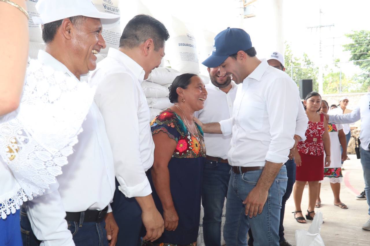 Luego, Vila Dosal distribuyó 8,000 sacos de 20 kilogramos de maíz para consumo humano en este municipio, así como 200 bultos de 50 kilogramos de fertilizante para iniciar con la preparación de la tierra, previo al inicio de la temporada de lluvias.