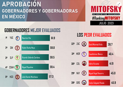 En contraste, en la parte inferior de la tabla se encuentran Indira Vizcaíno (Colima), Cuauhtémoc Blanco (Morelos) y David Monreal (Zacatecas) con un 41.9%, 40.4% y 38.7%, respectivamente, todos ellos pertenecientes a Morena y sus aliados.