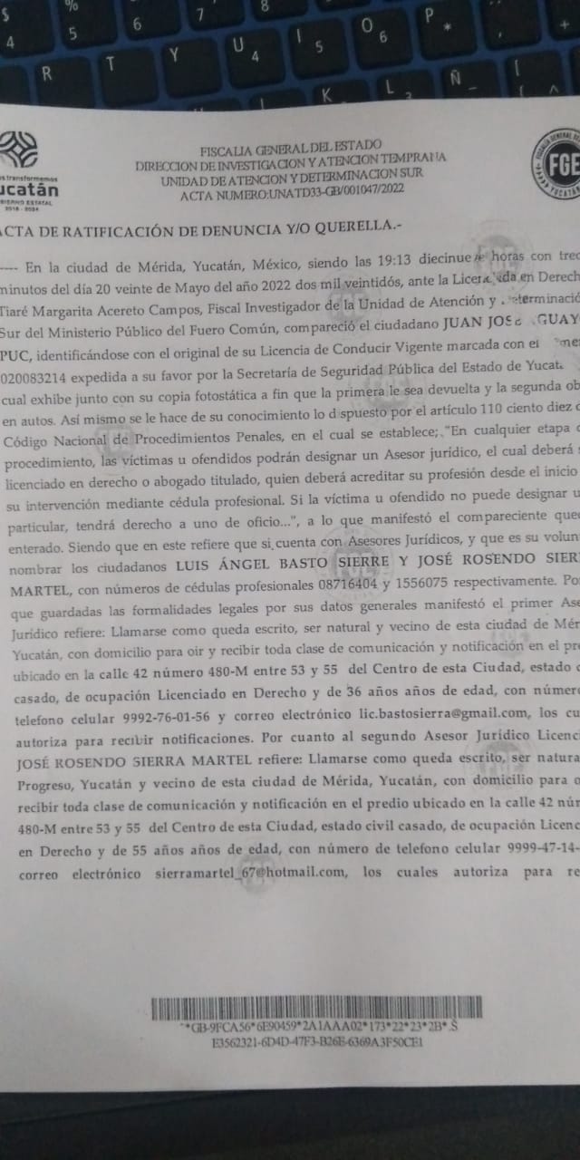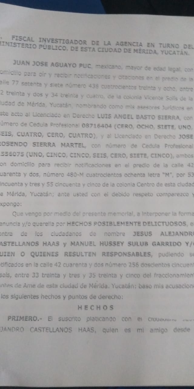 Alejandro Castellanos Haas y Manuel Sulub Garrido y quienes resulten responsables fueron acusados de robo y abuso de confianza, ante la agente del Ministerio Público Licda. Tiare Margarita Acereto Campos, por Juan José Aguayo Puc.