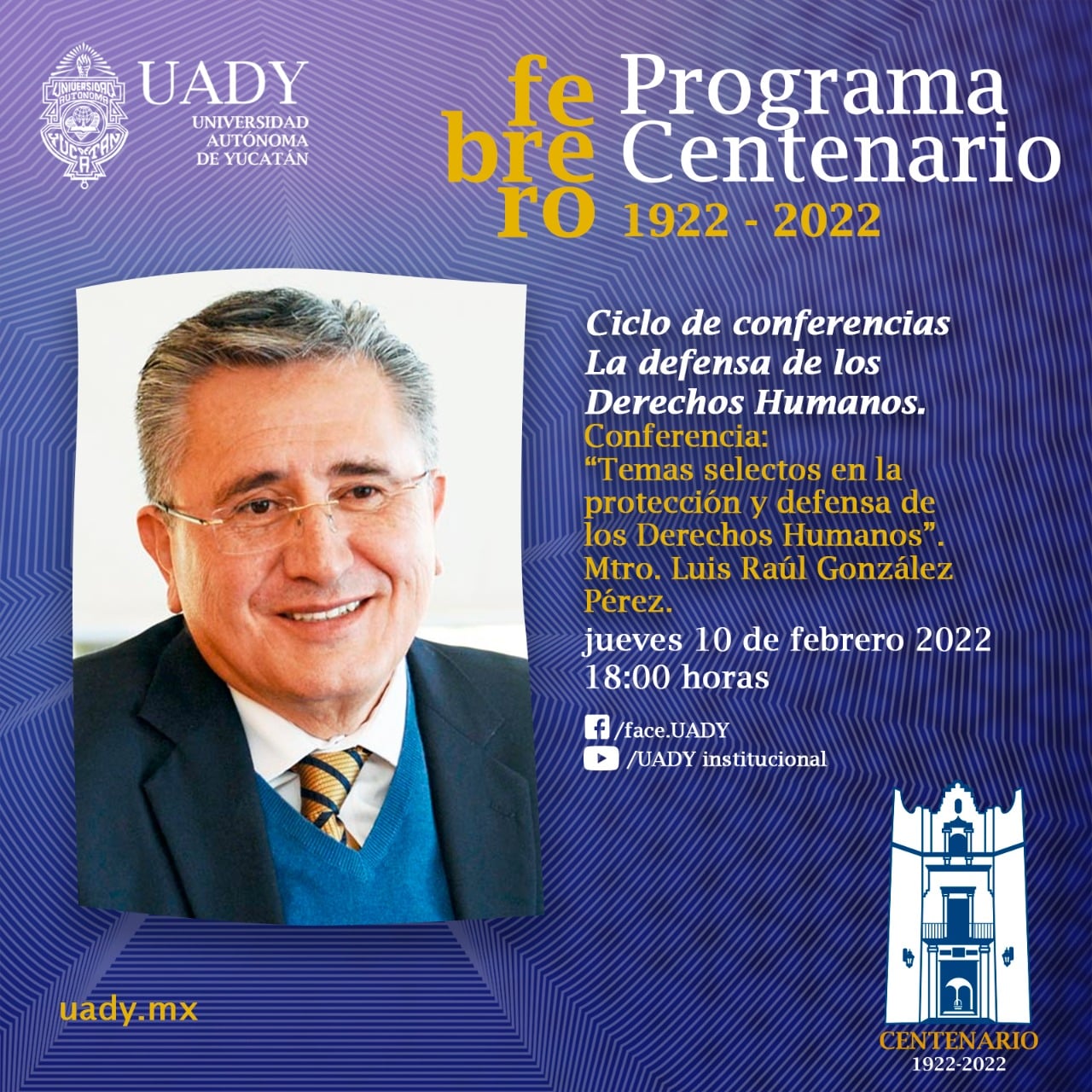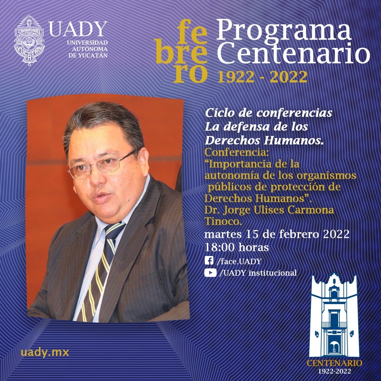 Este ciclo titulado “La defensa de los Derechos Humanos”, que forma parte de los eventos con motivo de la celebración del Centenario de la UADY, se llevará a cabo en modalidad virtual los días 8,9,10 y 15 de febrero, informó el Abogado General de esta casa de estudios, Renán Solís Sánchez.
