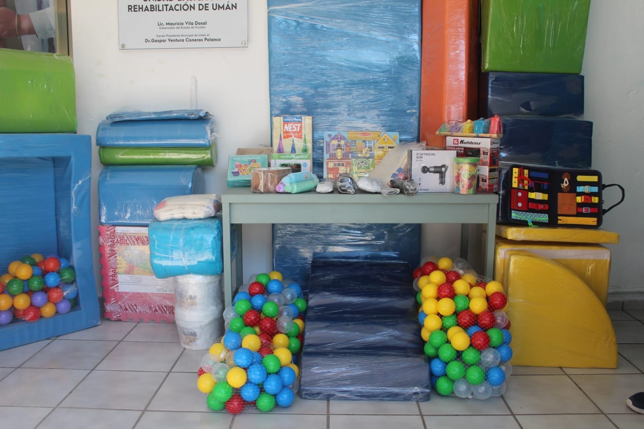 Por gestiones del Presidente Municipal de Umán, Dr. Gaspar Ventura Cisneros Polanco ante el DIF Estatal Yucatán se realizó la entrega de material como juegos didácticos para trabajar motricidad fina, set de estimulación temprana e insumos para electroterapia que serán destinados para el equipamiento de las áreas de terapia de la Unidad Básica de Rehabilitación UBR.