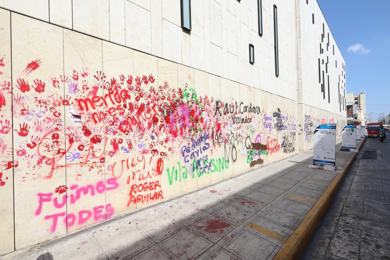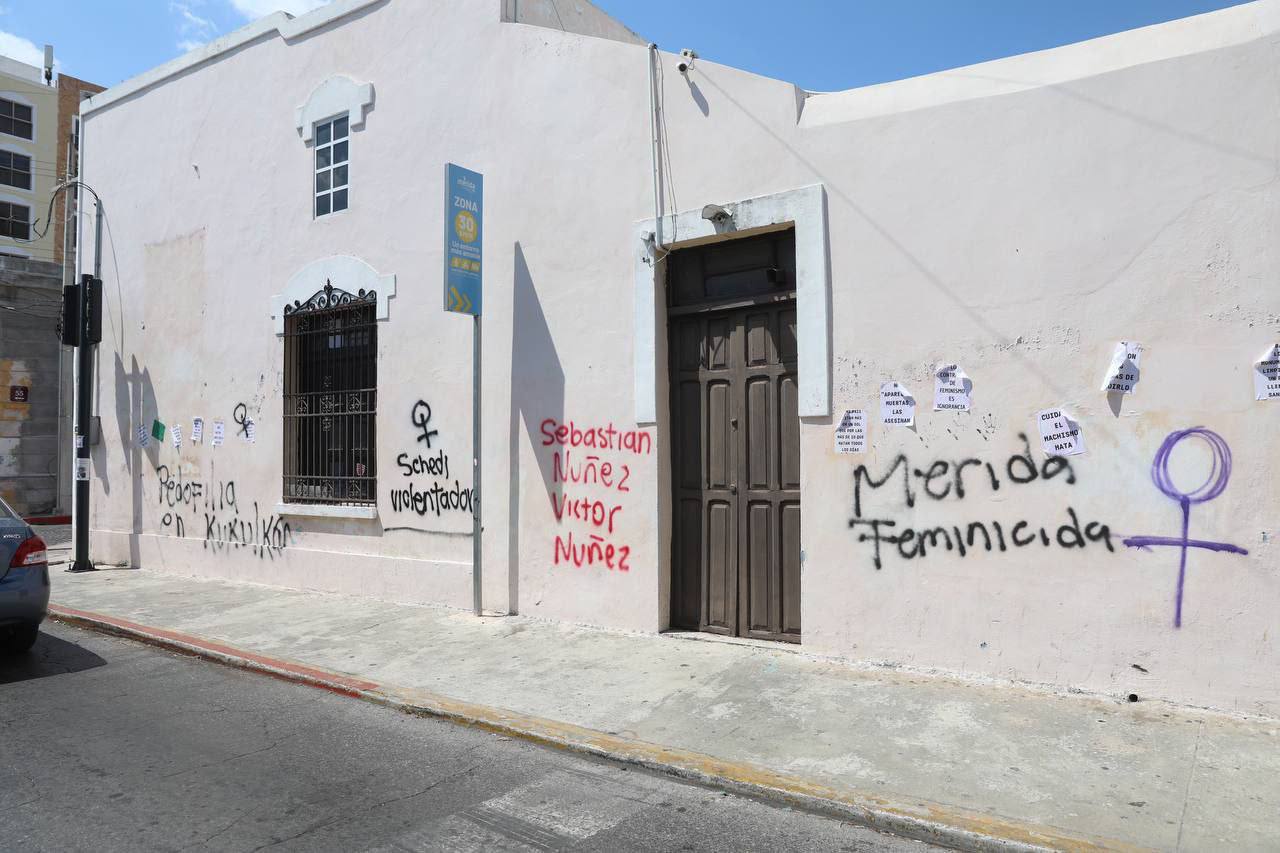 Entre los sitios que se vieron afectados se encuentra la Catedral de Mérida, sitio histórico de más de 400 años de antigüedad, el cual la noche de ayer fue pintado por manifestantes encapuchadas que dejaron plasmadas consignas y símbolos feministas.