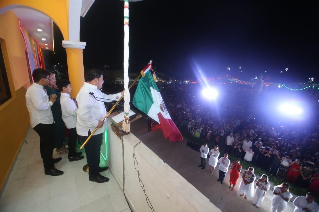 Acompañado de su esposa, Raquel Balam Rocha de Bojórquez, y de sus tres hijos, el edil lanzó el tradicional Grito de Independencia desde el balcón de la sede municipal, luego de que el secretario del Ayuntamiento de Kanasín, Hilario Uicab Can, leyera el acta de Independencia de México.