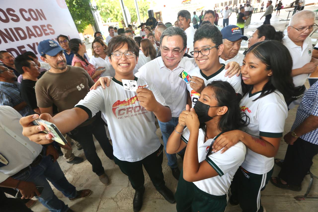 En el municipio de Acanceh, acompañado del presidente municipal, Mario Cruz Herrera y la diputada Manuela Cocom Bolio, Vidal Aguilar hizo entrega de los kits “Mejora tu Secu” a 6 planteles educativos de la cabecera y las comisarías de Tepich Carrillo, Canicab, Petectunich y Ticopó.