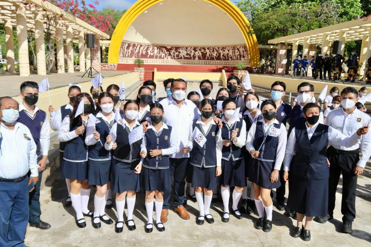 En el presídium acompañaron al Alcalde, Rafael Rodríguez Méndez, regidor presidente de la Comisión de Juventud, Deportes y Educación; Alejandro Ruz Castro, secretario municipal; Mario Arturo Romero Escalante, director de la Policía Municipal; Juan Manuel Díaz Roche, presidente de la Fundación del Empresariado Yucateco A.C. (FEYAC) y las estudiantes Nicole Martínez Morales, de la Comunidad Estudiantil “Alianz” y Sara Duran Ávalos, de la preparatoria “Jenaro Rodríguez Correa”.