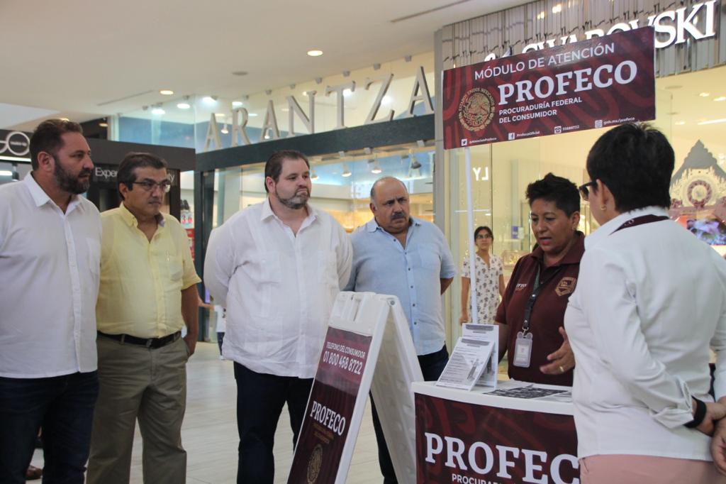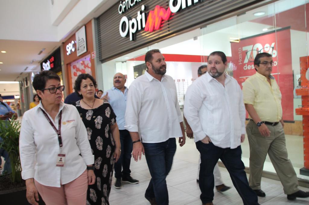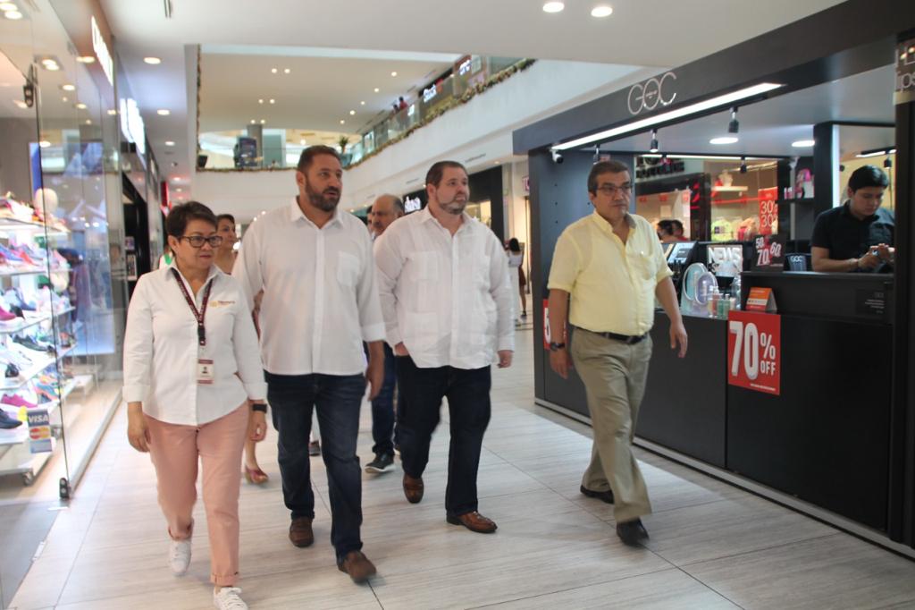El presidente de la Cámara de Comercio, Servicios y Turismo de Mérida, Iván Rodríguez Gasque, acompañado de la encargada de la Oficina de la Profeco en Yucatán, Martha Velázquez Castro; el delegado de CONDUSEF en Yucatán, Alberto Pinto Escamilla; el director de Desarrollo Económico y Turismo del Ayuntamiento de Mérida, José Luis Martínez Semerena y la directora general de Plaza Altabrisa, Dolores Vázquez, platicaron con personal de las tiendas para conocer sobre la afluencia registrada en los negocios durante El Buen Fin.