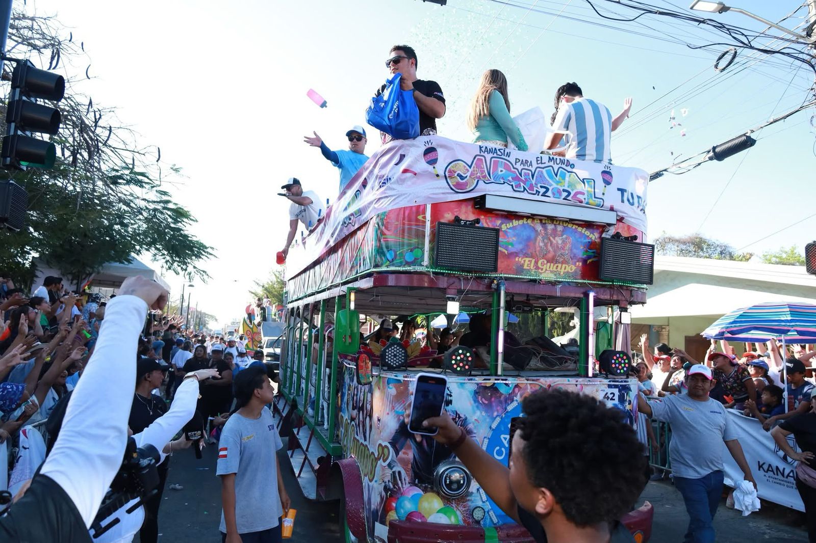 La locura se desató en cada tramo del recorrido con el paso de Galilea Montijo, Brandon Peniche y Jawy Méndez, quienes en todo momento lanzaban besos y saludos a las miles de personas instaladas en el recorrido. Celulares en mano, niños, jóvenes, adultos y hasta personas de la tercera edad grababan en video o tomaban imágenes de sus artistas favoritos o de las comparsas para guardarlos para la posteridad. Con fortuna, alguno de ellos tendría la esperada imagen de la mirada, el beso o el saludo de su artista favorito mirando hacia la cámara.