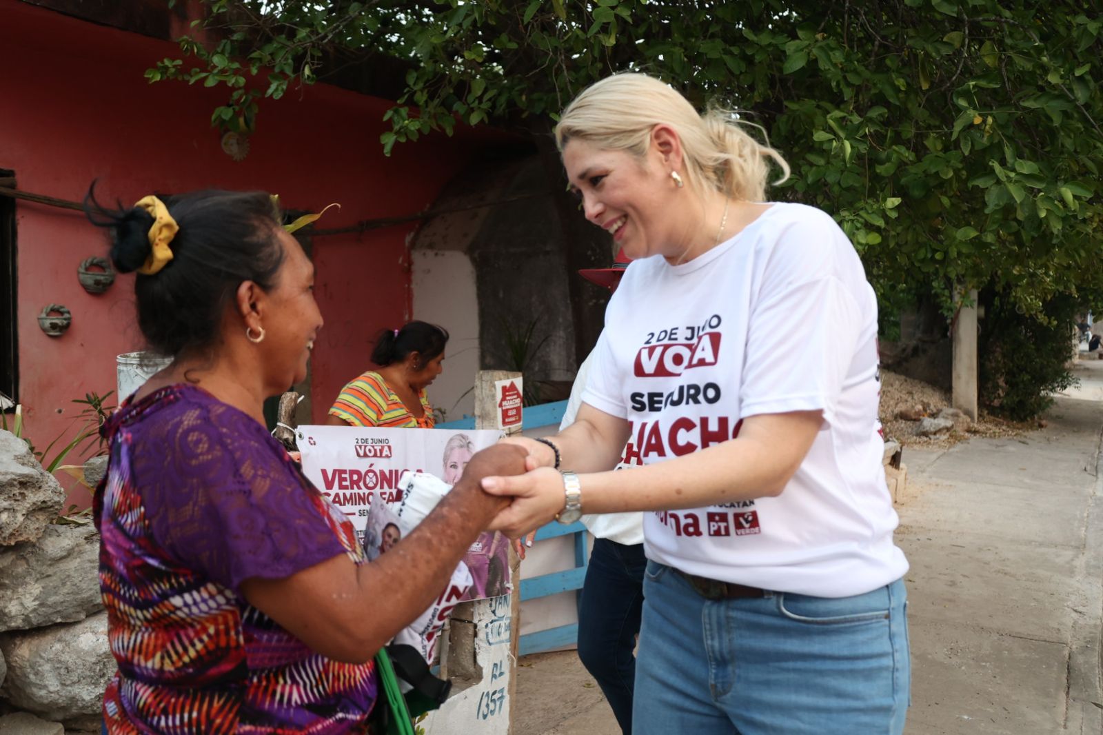 Verónica Camino Farjat, candidata a la primera fórmula al Senado de la República por la coalición Sigamos Haciendo Historia, recorrió la comisaría meridana de Oncán, acompañada de la candidata a diputada local por el IX Distrito, Elisa Zuñiga Arellano, donde resaltó la fuerza del deseo del cambio que está moviendo a mujeres y hombres a estar del lado de la Cuarta Transformación.