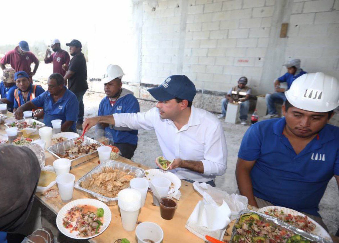 Tras disfrutar de los tacos de chicharra, el Gobernador intercambio algunas anécdotas y bromas con los albañiles provenientes de Cantamayec, Halachó y Teabo que se dieron cita a la convivencia.