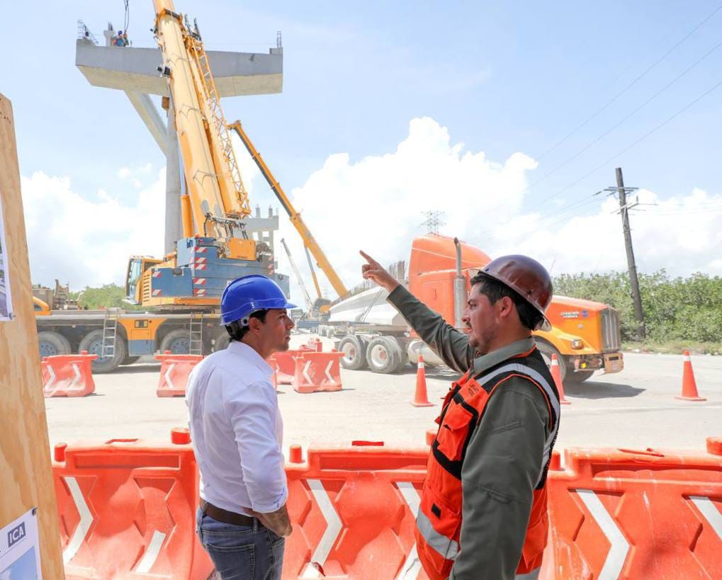 Acompañado del delegado de la Secretaría de Infraestructura, Comunicaciones y Transportes (SICT), Luis Manuel Pimentel Miranda, Vila Dosal constató las labores de colocación de las trabes del último tramo de esta importante obra que permitirá