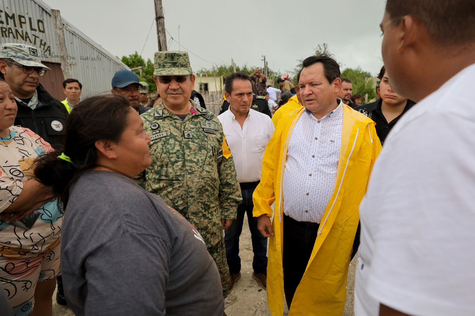 Acompañado del alcalde de Celestún, Germán Jesús Cauich Pinto, representantes de la Marina, las Fuerzas Armadas, y de Seguridad del Estado (SSP), el Gobernador visitó el albergue temporal habilitado en la iglesia de La Purísima Concepción, ubicada a un costado del palacio municipal, donde conversó con las personas que desde anoche se trasladaron a este lugar para sortear los fuertes vientos y la lluvia que trajo consigo este fenómeno.