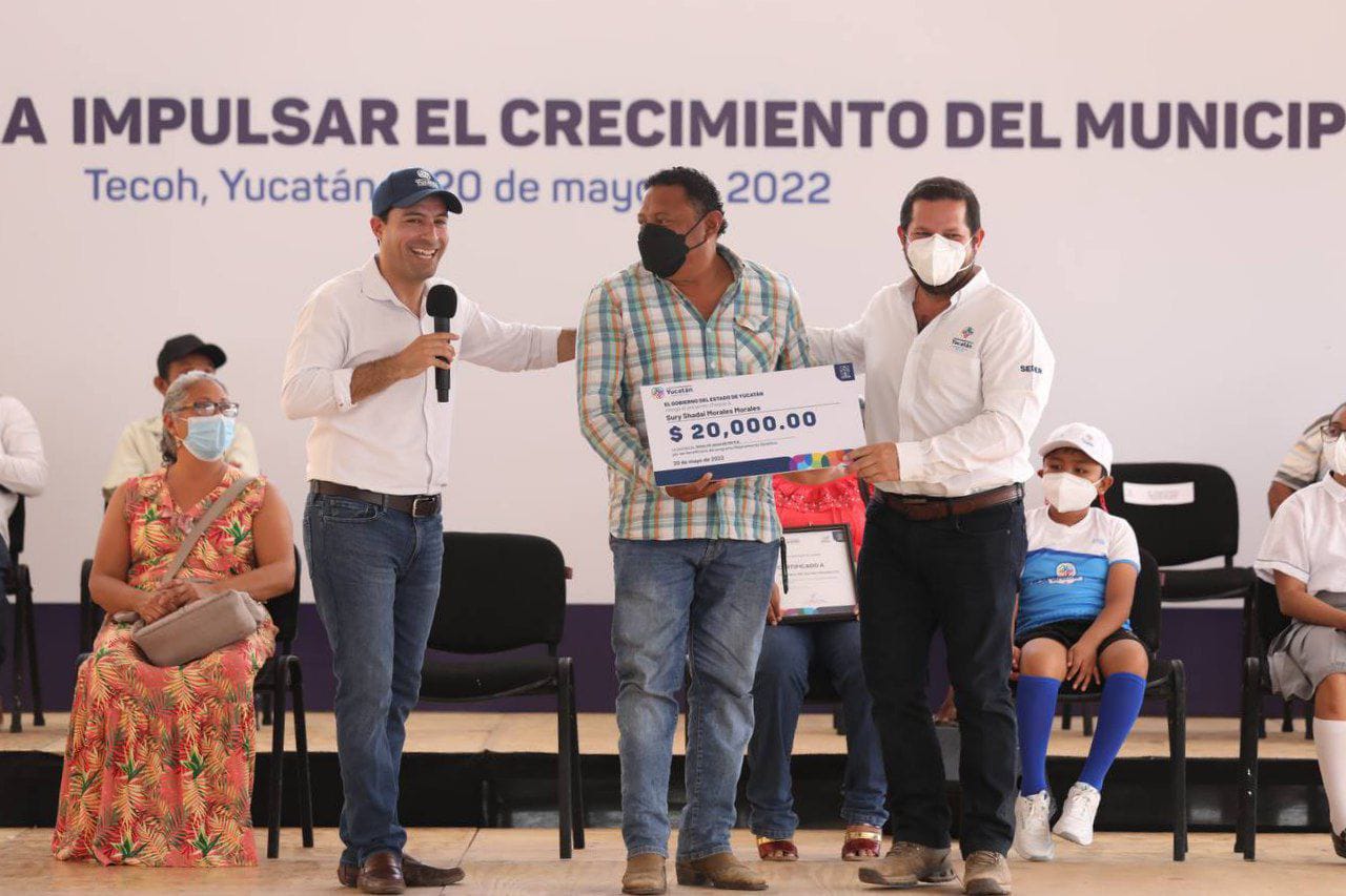 Acompañado de los titulares de las Secretarías de Desarrollo Social (Sedesol), Roger Torres Peniche; Rural (Seder), Jorge Díaz Loeza, y de Educación (Segey), Liborio Vidal Aguilar, Vila Dosal indicó que se está apoyando a Tecoh más que nunca, por lo que hizo un recuento de los programas y las estrategias estatales, que están favoreciendo a las familias de este municipio.
