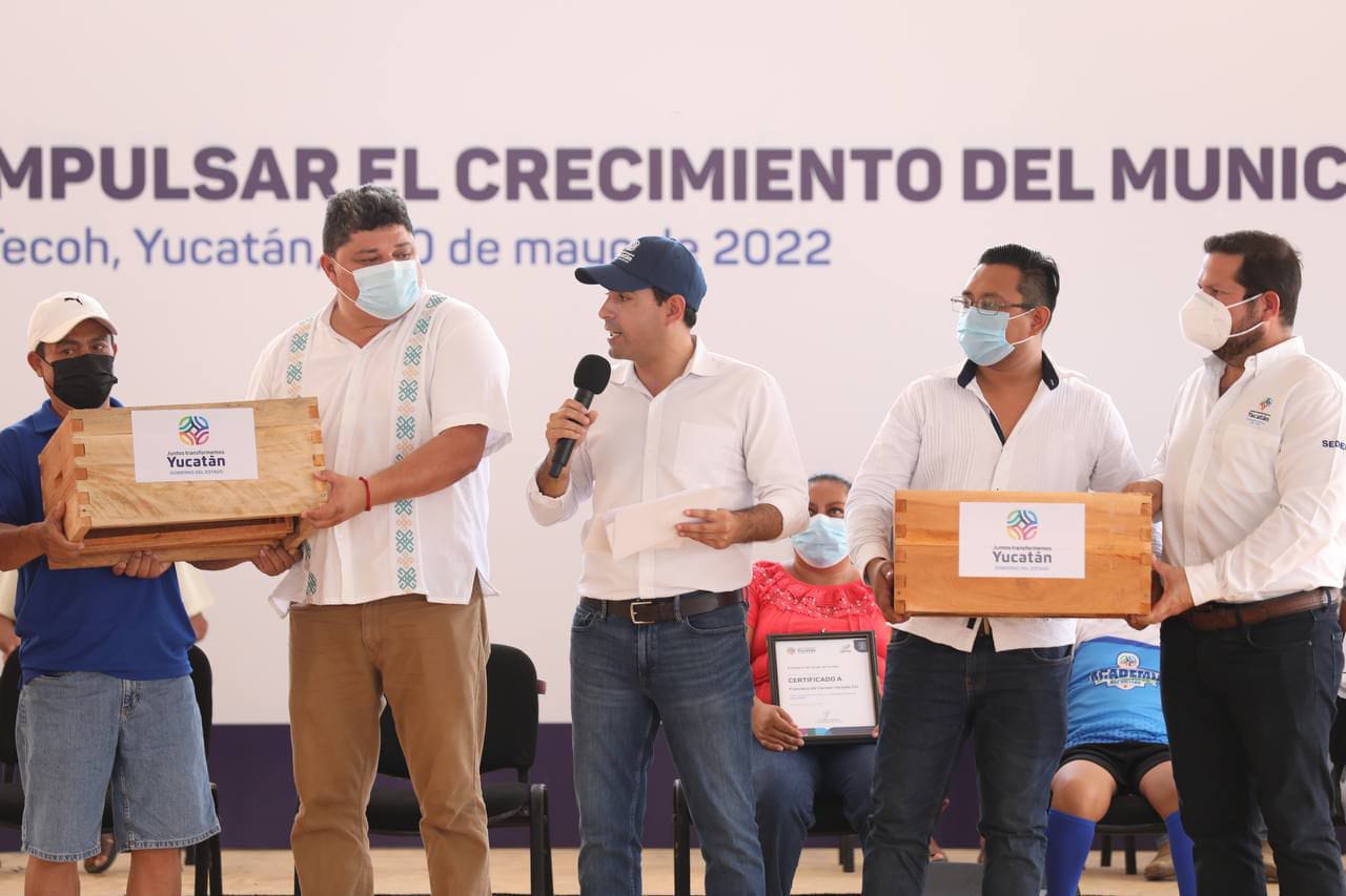 También, Vila Dosal continuó con la distribución de apoyos en materia de vivienda, educación, apicultura y agro, en respaldo a la producción de mujeres y hombres de esos sectores.
