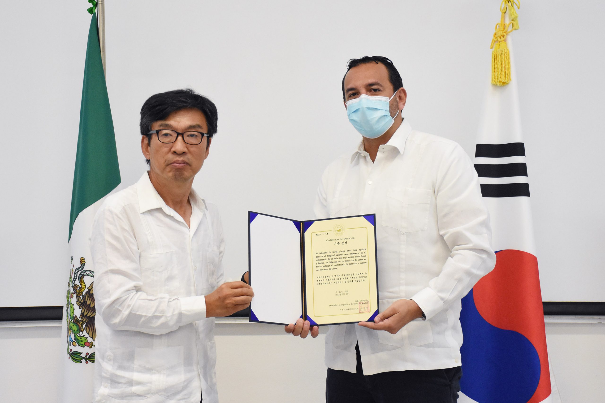 El Hospital de la Amistad Corea-México recibió al Embajador de esa República, Suh Jeong-In, que entregó un certificado para equipamiento médico por un monto de más de 80 mil dólares, acompañado del titular de la Secretaría de Salud de Yucatán (SSY), Mauricio Sauri Vivas, en representación del Gobernador Mauricio Vila Dosal.Al agradecer por estos apoyos, el funcionario estatal enfatizó que “este donativo, sumado a la atención médica de calidad, por parte de las y los profesionales de la salud, contribuirá a consolidar la atención médica pediátrica brindada a la infancia del estado”.Destacó que, desde su construcción e inauguración, el 5 de julio de 2005, dicho nosocomio ha sido un símbolo de la fraternidad y cooperación entre ambos territorios, y refrendó el compromiso, la vocación y el humanismo de todo su personal, en beneficio de la población.