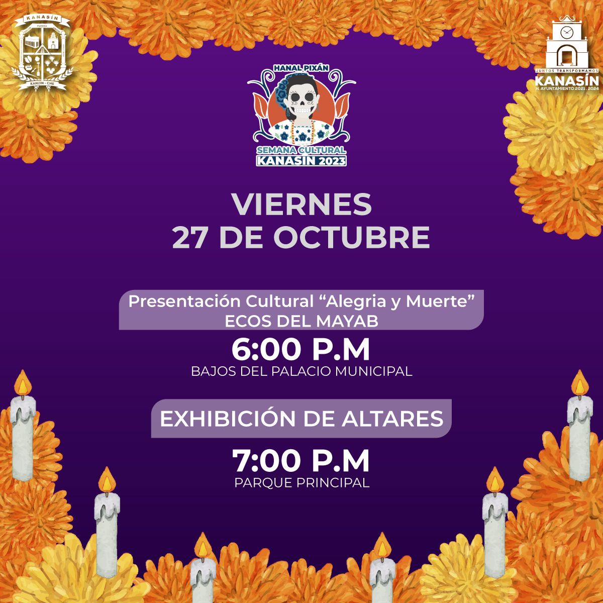 Como parte de las actividades que se han preparado, para el viernes 27 de octubre, a partir de las 18 horas, se realizará el bloque cultural “Alegría y Muerte”, en el que participarán alumnos del grupo artísticos Ecos del Mayab. Posteriormente, a las 19 horas se inaugurará la Exhibición de Altares en la plaza principal, en la que se espera la participación de instituciones educativas y de la sociedad civil organizada.