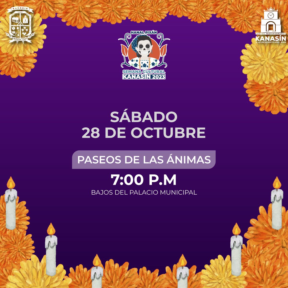 El sábado 28 de octubre se realizará el Paseo de las Ánimas a partir de las 19 horas, el cual arrancará en el cementerio municipal y terminará en los bajos del palacio municipal. Para este día se espera la participación de asociaciones civiles, grupos artísticos, adultos mayores, integrantes del ballet del Ayuntamiento de Kanasín, integrantes de la Casa del Adulto Mayor, entre otros, además de que el Ayuntamiento invita a toda la población a participar este día en el Paseo de las Ánimas.