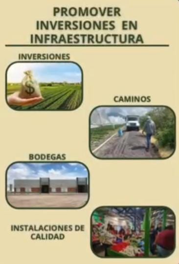 Propuso promover las inversiones en infraestructura apoyando la construcción de infraestructura física de mercados, así como caminos entre granjas y localidades aumentará la capacidad de producción, creando oportunidades para todos.