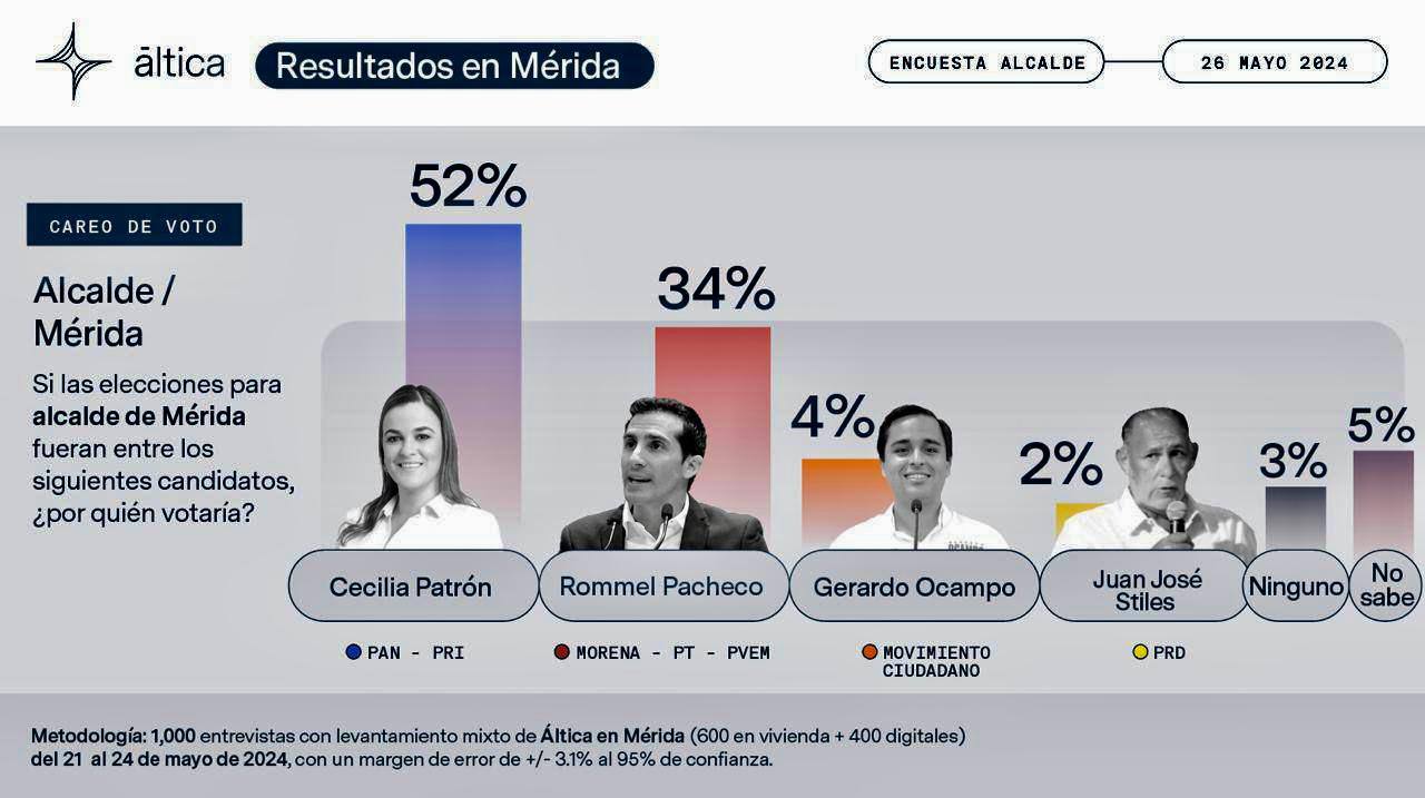 Con respecto a los demás candidatos en la contienda, la ventaja de Cecilia Patrón -la única candidata mujer que compite por la alcaldía de Mérida- es aún más amplia, entre 42.9 y 52.4 puntos sobre Gerardo Ocampo Castro, candidato de Movimiento Ciudadano, y Juan José Stiles Ramos, candidato del PRD, quienes aparecen muy abajo en las encuestas.
