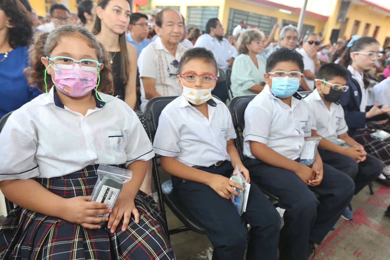 Con el fin de contribuir a un mejor desempeño escolar de alumnas y alumnos de escuelas de nivel primaria y secundaria de Tizimín, el titular de la Secretaría de Educación del Gobierno del Estado, Liborio Vidal Aguilar, entregó lentes, mobiliario escolar y kits de la estrategia “Mejora tu Secu”.Acompañado del alcalde del municipio, Pedro Couoh Suaste, la coordinadora del programa “Ver bien para aprender mejor”, Magally Cruz Nucamendi, autoridades educativas, docentes, estudiantes y sociedades de padres de familia, Vidal Aguilar encabezó la actividad en la escuela primaria “Manuel Alcalá y Alcalá”, donde se dieron cita los colectivos de los centros educativos beneficiados.La directora de la escuela sede, María Teresa Aguilar Gamboa, agradeció estos beneficios que representan una gran diferencia en la vida de los estudiantes que necesitan una herramienta tan importante como los lentes, para poder aprovechar mejor sus clases y dar mejores resultados en sus procesos de aprendizaje.