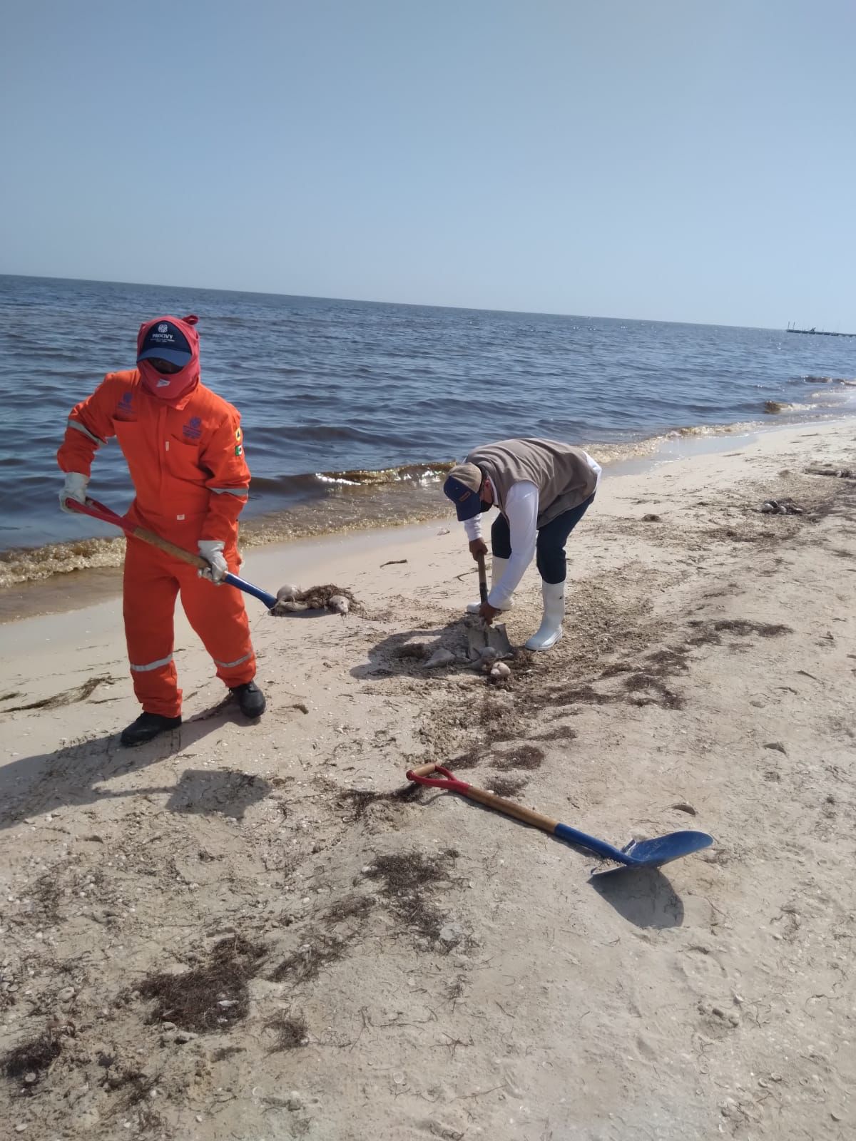 Resultado de las tareas de limpieza y vigilancia permanente que se mantiene en la zona de marea roja en Yucatán, efectivos del Ejército provenientes del 11 y 7 Batallón de Infantería y de Ingenieros de Combate, junto a personal del Gobierno estatal recogieron 1,150 kilos de peces muertos los cuales son depositados y cubiertos en 90 fosas de metro y medio cavadas para ese fin.