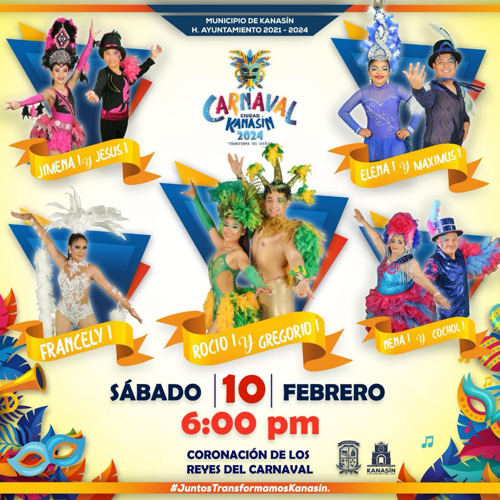 Los soberanos Rocío I y Gregorio I, los reyes infantiles Jimena I y Jesús I, los reyes de la discapacidad Elena I y Máximus I, de la tercera edad, Nena I y Gonzalo I; así como de la comunidad LGBT, Francely I, recibirán la tarde-noche de mañana sábado sus respectivas coronas para iniciar de manera formal con el Carnaval de Kanasín 2024 “Transforma tus Sueños”, el cual encabezará el alcalde Edwin Bojórquez Ramírez.