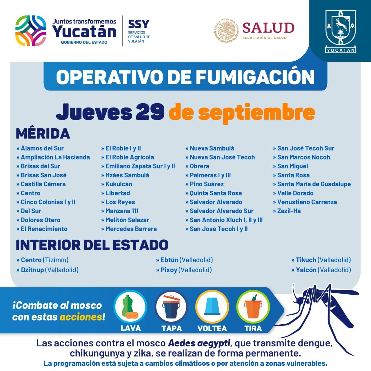 En los primeros 4 días, la Secretaría de Salud de Yucatán (SSY), sumando esfuerzos con el Ayuntamiento de Mérida, fumigó alrededor de 4,020 hectáreas de superficie en la capital yucateca como parte del segundo barrido de fumigación, trabajos que continuarán hasta el 7 de octubre, abarcando 270 colonias con el objetivo de prevenir enfermedades transmitidas por los moscos.