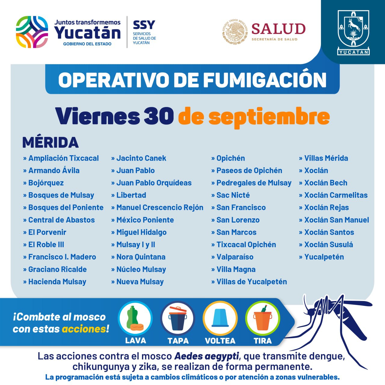 La Secretaría de Salud y el Ayuntamiento meridano ha fumigado, en las primeras 4 jornadas del segundo barrido, alrededor de 4,020 hectáreas de superficie en la capital. / Estas acciones, que incluyen tareas de fumigación, control larvario y nebulización, continuarán hasta el 7 de octubre.