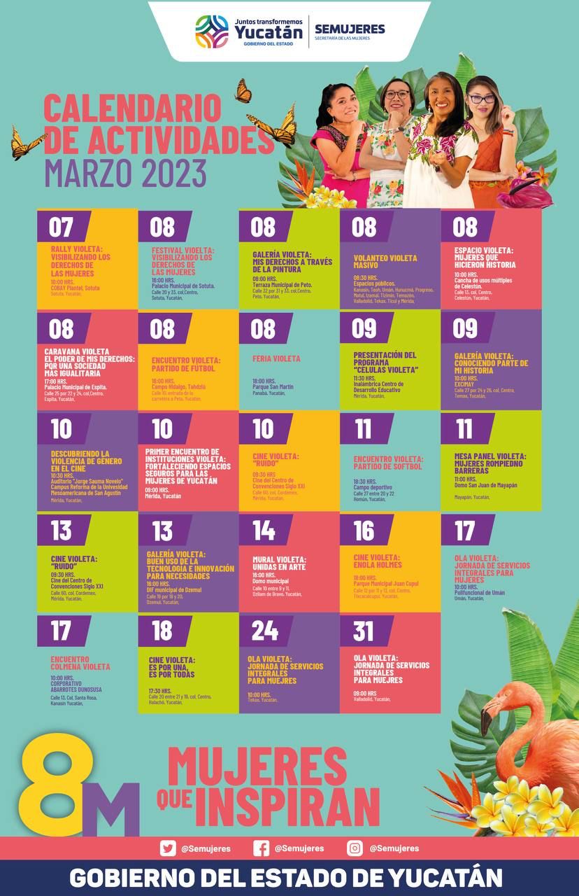 De igual manera, durante todo marzo habrá una cartelera de actividades presenciales como el Volanteo Masivo Violeta el miércoles 8, en Mérida, Kanasín, Tecoh, Umán, Hunucmá, Progreso, Motul, Izamal, Tizimín, Temozón, Valladolid, Tekax y Ticul.