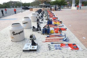 Se distribuyó motobombas, motosierras, aspersoras, rastrillos McLeod y convencionales, hachas tipo Pulaski, machetes, machetillos, palas, abate fuegos, cascos, anteojos especiales, camisolas, botas, pañoletas y tinacos, los cuales se destinarán a Kanasín, Conkal, Baca, Motul, Yobaín, Temax, Buctzotz, Huhí y Tecoh