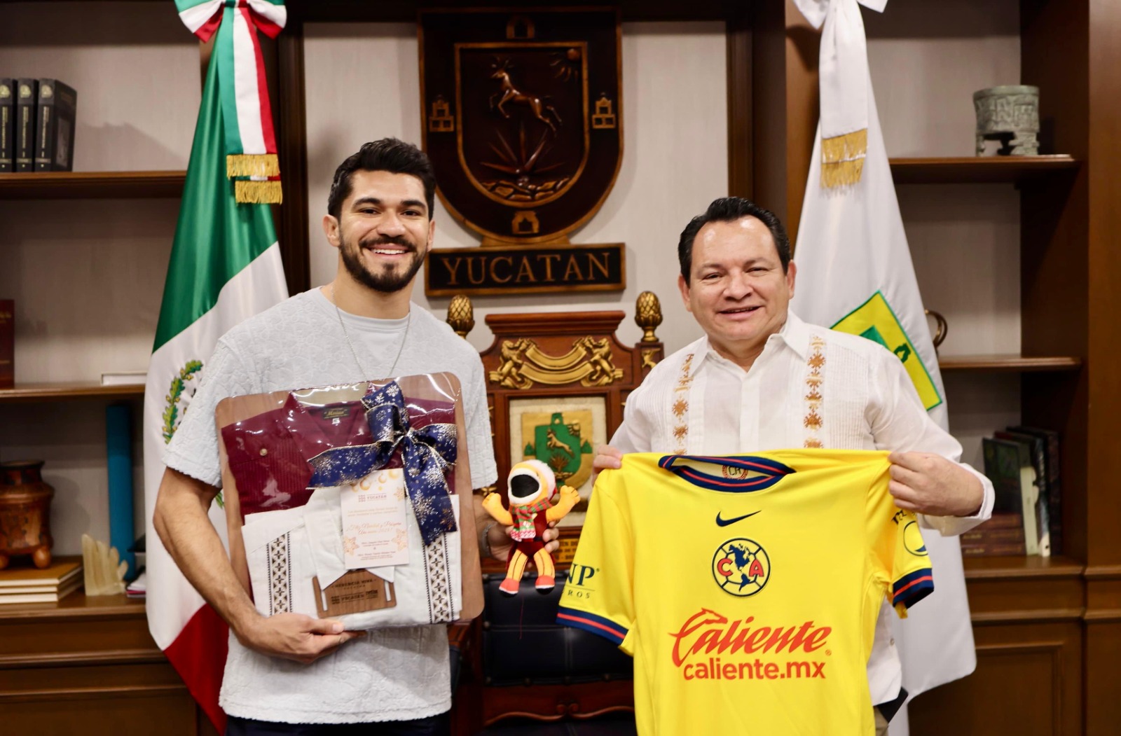 El mandatario estatal recibió al delantero americanista en su despacho, en Palacio de Gobierno, para platicar sobre su gran desempeño en la más reciente temporada con el equipo azulcrema, así como sobre el gran modelo a seguir en el que se ha convertido para las yucatecas y los yucatecos de todas las edades.