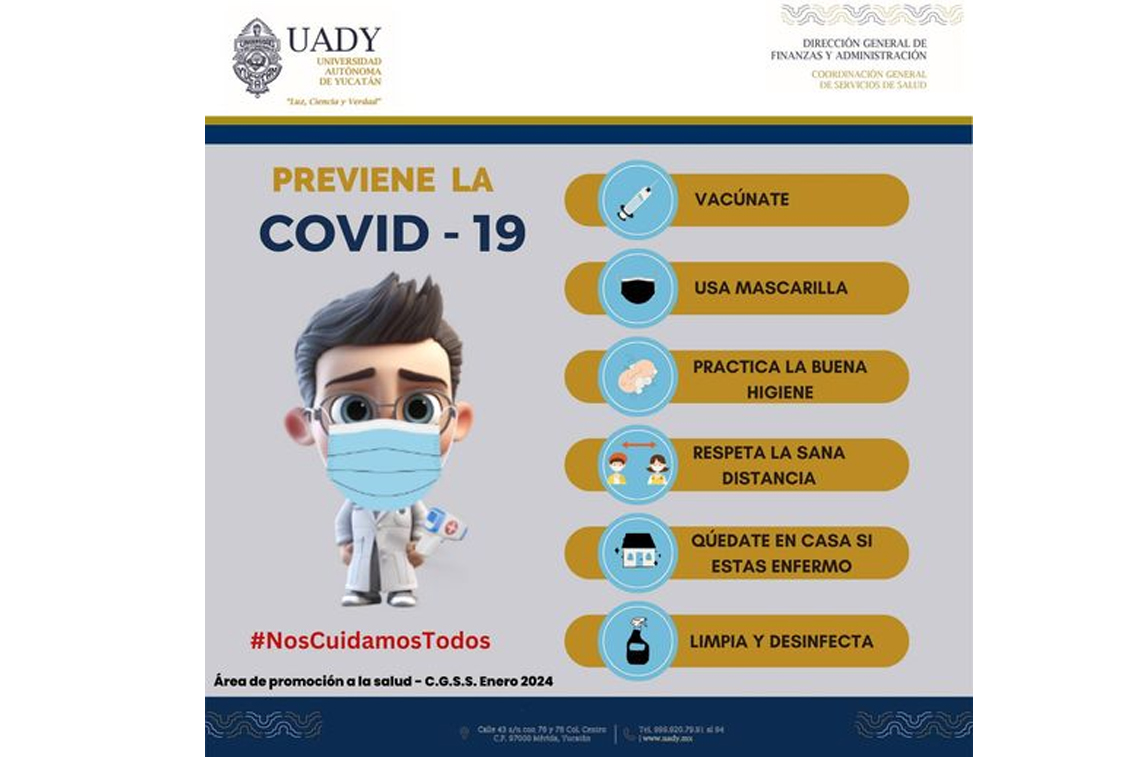 La Covid-19, acompañada de la influenza, son virus que pueden prevenirse con los adecuados cuidados y la pronta aplicación de ambas vacunas, especialmente en las personas más vulnerables, afirmó el coordinador general de Servicios de Salud de la Universidad Autónoma de Yucatán (UADY), Edgar García Santamaría.