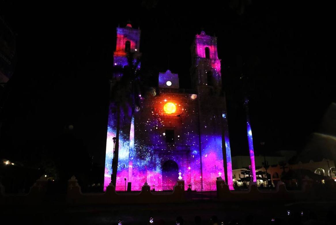 Tras plasmarse en la fachada de la iglesia un ritual para pedir permiso, la función comenzó con ilustraciones sobre la memoria prehistórica de la Península con el impacto del meteorito, su origen y su naturaleza tan particular; después, se plasma la cosmología maya de los cenotes para dar paso a ilustraciones sobre la cultura maya y la antigua ciudad del Ek Balam.