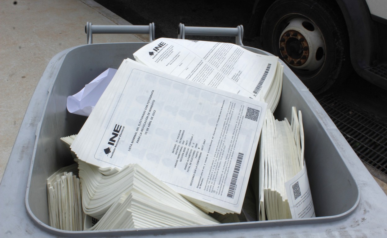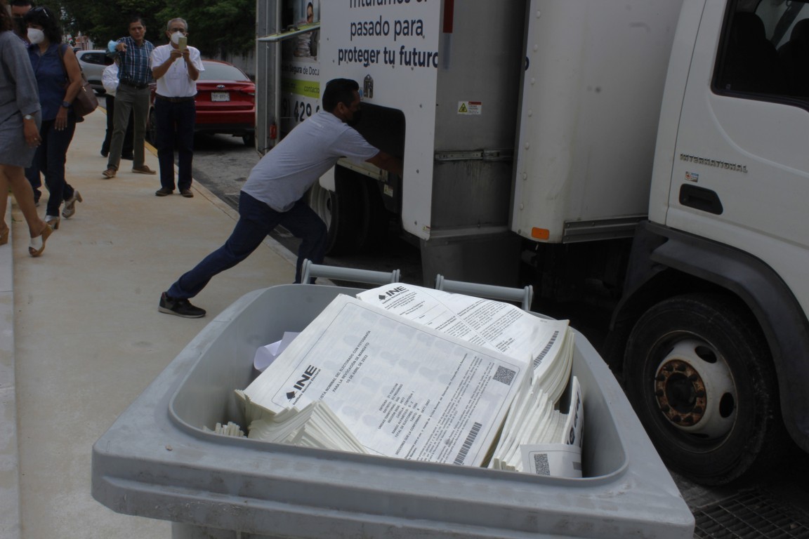 La Junta Local del Instituto Nacional Electoral en Yucatán, con el acompañamiento de la Comisión Local de Vigilancia del Registro Federal de Electores, llevó a cabo la destrucción de 1 mil kilogramos de listas nominales de electores que se entregaron a las representaciones de los partidos políticos para su uso en la jornada de Revocación de Mandato del pasado 10 de abril y que fueron devueltas al INE.