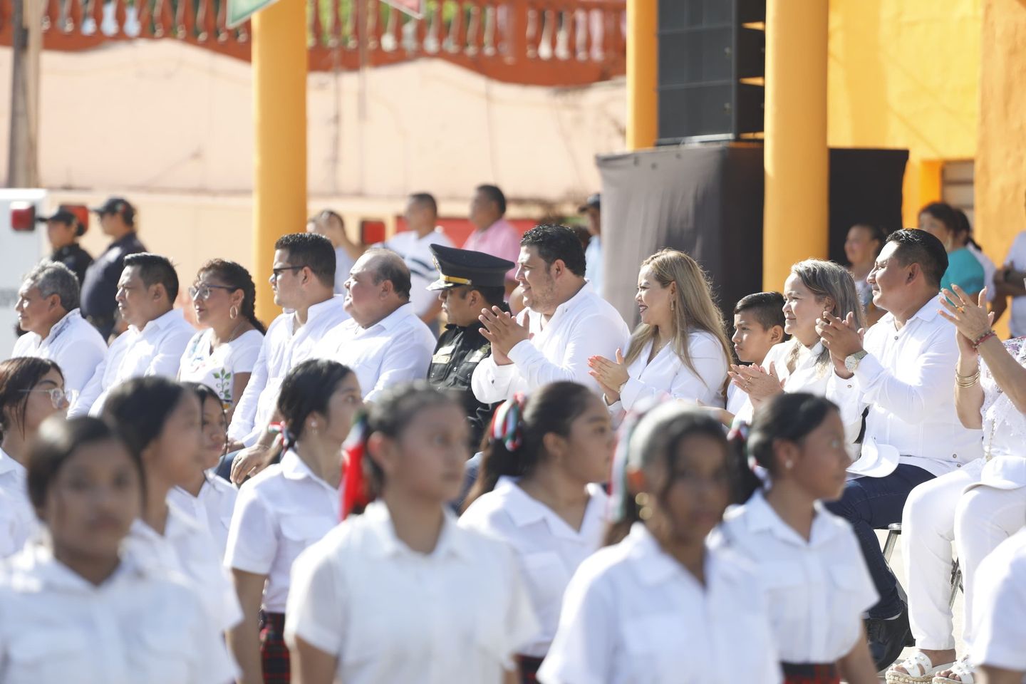 La maestra Thelma Ku Acosta, directora de la escuela primaria “Miguel Alemán” del turno matutino, dirigió unas palabras para luego dar paso al Juramento a la Bandera que estuvo a cargo del estudiante Noé Isidro Puch, alumno del mismo plantel.