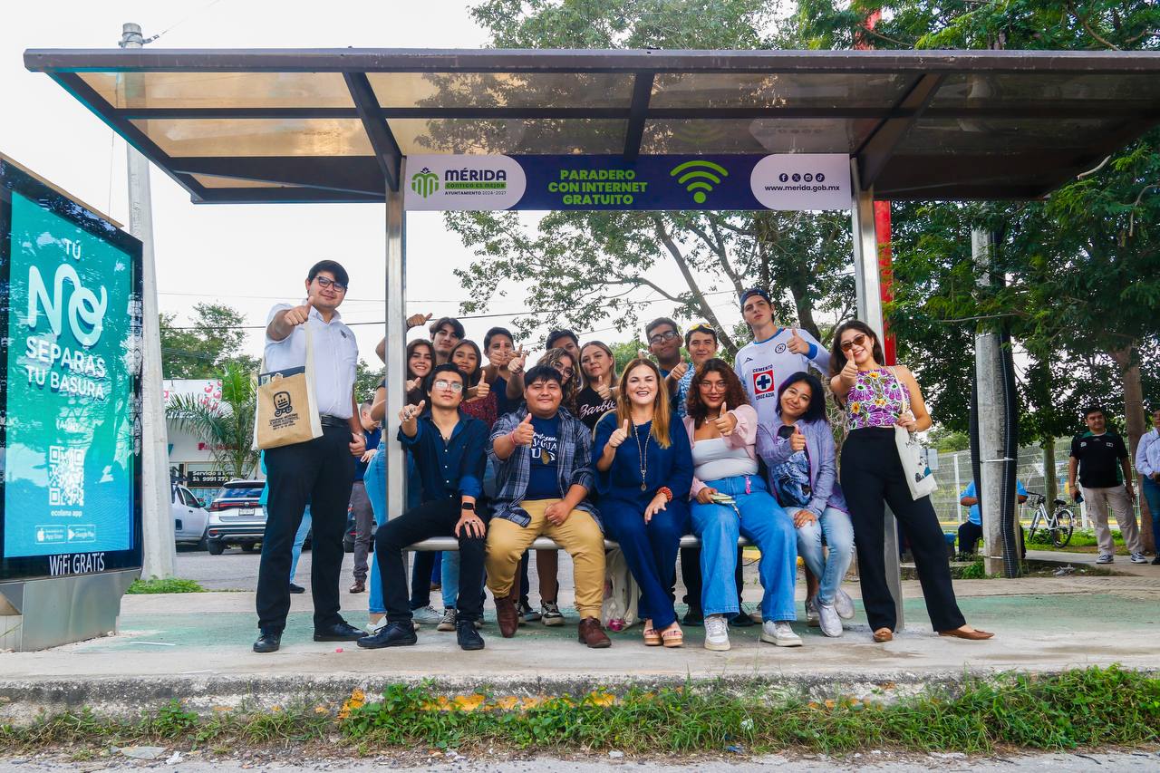 Junto a estudiantes visita uno de los 22 paraderos que ya cuenta con este servicio. Mejoran los espacios de Mérida con justicia social y diseño innovador.