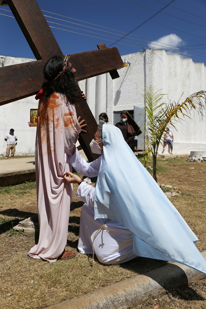 Sin importar los intensos rayos del sol que en ese momento se hacían presentes, los participantes caminaron por patios y jardines del centro penitenciario representando en donde correspondía las diversas caídas que sufrió el mesías.